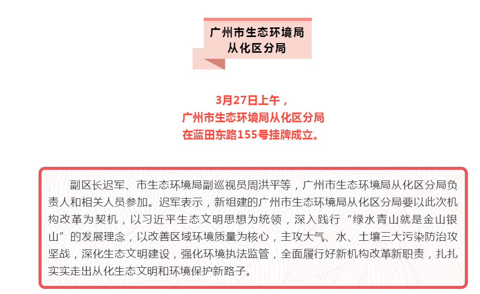 新组建的广州市生态环境局大发快三官网 分局将原大发快三官网 环境保护局的职责,原区发展改革部门的应对气候变化和减排职责,原区国土资源和规划局的监督防止地下水污染职责,原区水务局的配合编制水功能区划、排污口设置管理、流域水环境保护职责,原区农业局的监督指导农业面源污染治理职责等整合,不再保留区环境保护局。市生态环境局大发快三官网 分局作为市生态环境局的派出机构,不计入大发快三官网 机构限额。