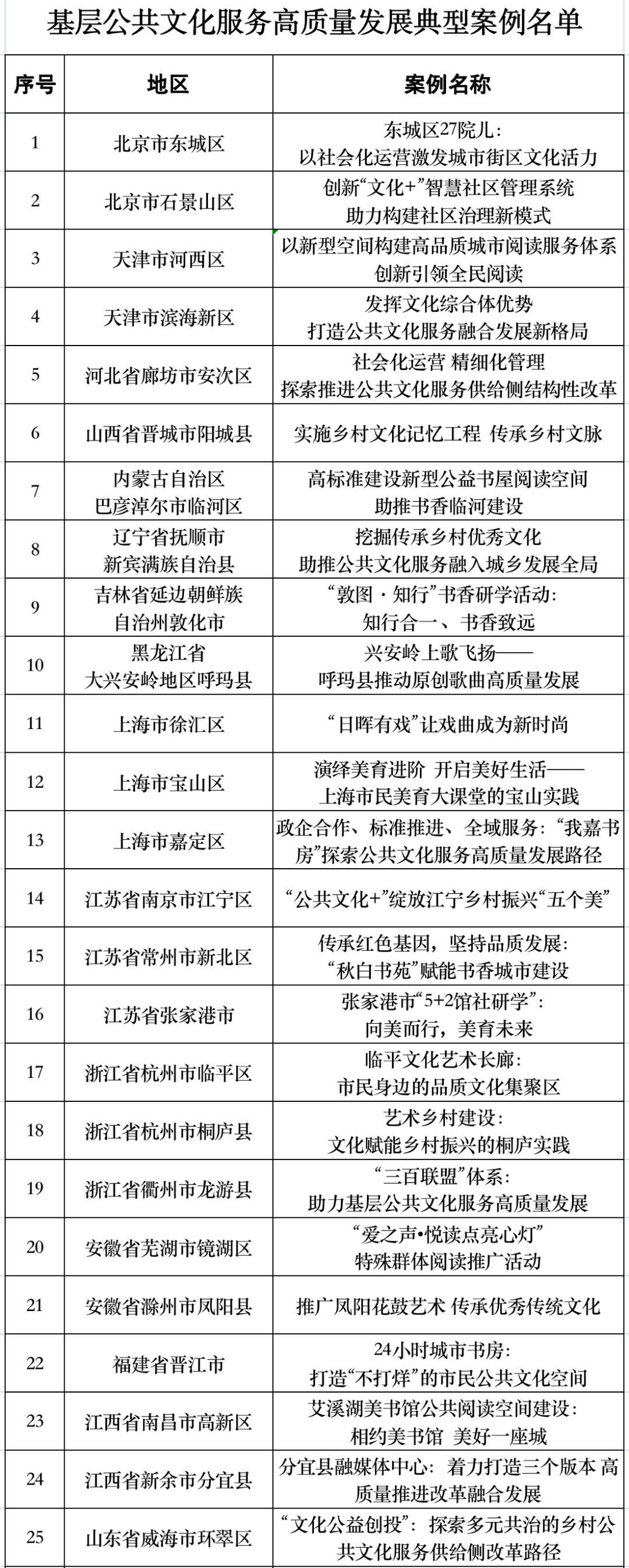 据了解,2021年9月,中央宣传部、国家发展改革委、文化和旅游部联合启动了基层公共文化服务高质量发展典型案例遴选工作。遴选工作开展以来,各地文化和旅游行政部门会同党委宣传部门、发展改革部门共推荐了196个案例。经专家认真遴选,确定51个案例为基层公共文化服务高质量发展典型案例。