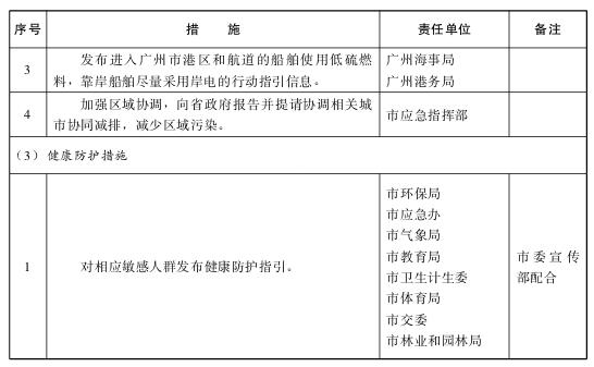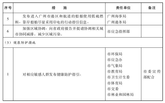 (17)广州港务局:负责加强到港船舶岸电使用和港口堆场扬尘污染控制,督促港口码头等人员密集场所做好环境空气重污染预警信息的接收和传播工作,在严重污染情况下开展港口船舶流量调控。