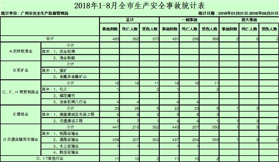 1-8月,全市发生交通运输和仓储业事故441起、死亡210人,同比分别下降11.1%和10.6%。其中,道路运输业发生事故438起、死亡207人;水上运输业发生事故1起、死亡1人;其他发生交通运输和仓储业事故2起、死亡2人,未发生铁路运输业和航空运输业事故。生较大道路交通事故1起、死亡3人;
