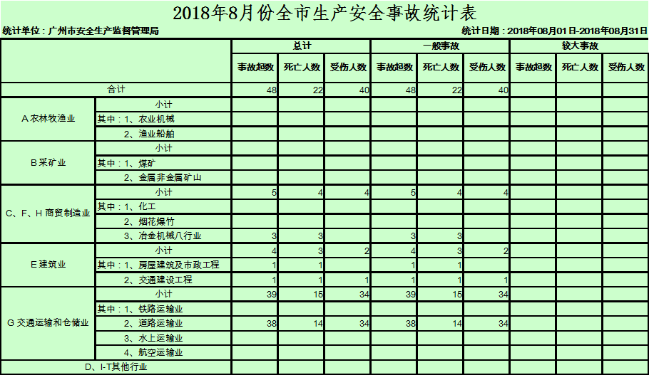 8月份,全市共发生交通运输和仓储业事故39起、死亡15人,同比分别下降41.8%、40%。其中,道路运输业发生事故38起、死亡14人。未发生较大事故。