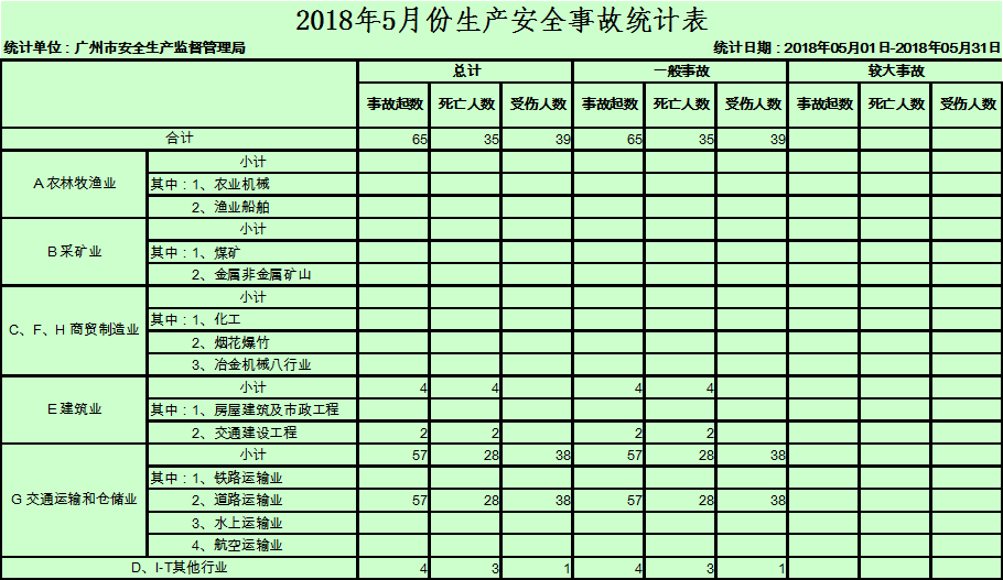 1-5月,建筑业和交通运输业事故起数和死亡人数同比“双下降”。其中:建筑业共发生事故11起、死亡15人,同比分别下降54.2%、48.3%;交通运输和仓储业共发生事故253起、死亡128人,事故起数和死亡人数分别占全市总量的89.40%、80%,同比分别下降15.9%、16.3%;工矿商贸制造业共发生事故19起、死亡17人,事故起数同比上升72.72%、112.5%;农林牧渔业、采矿业未发生事故。