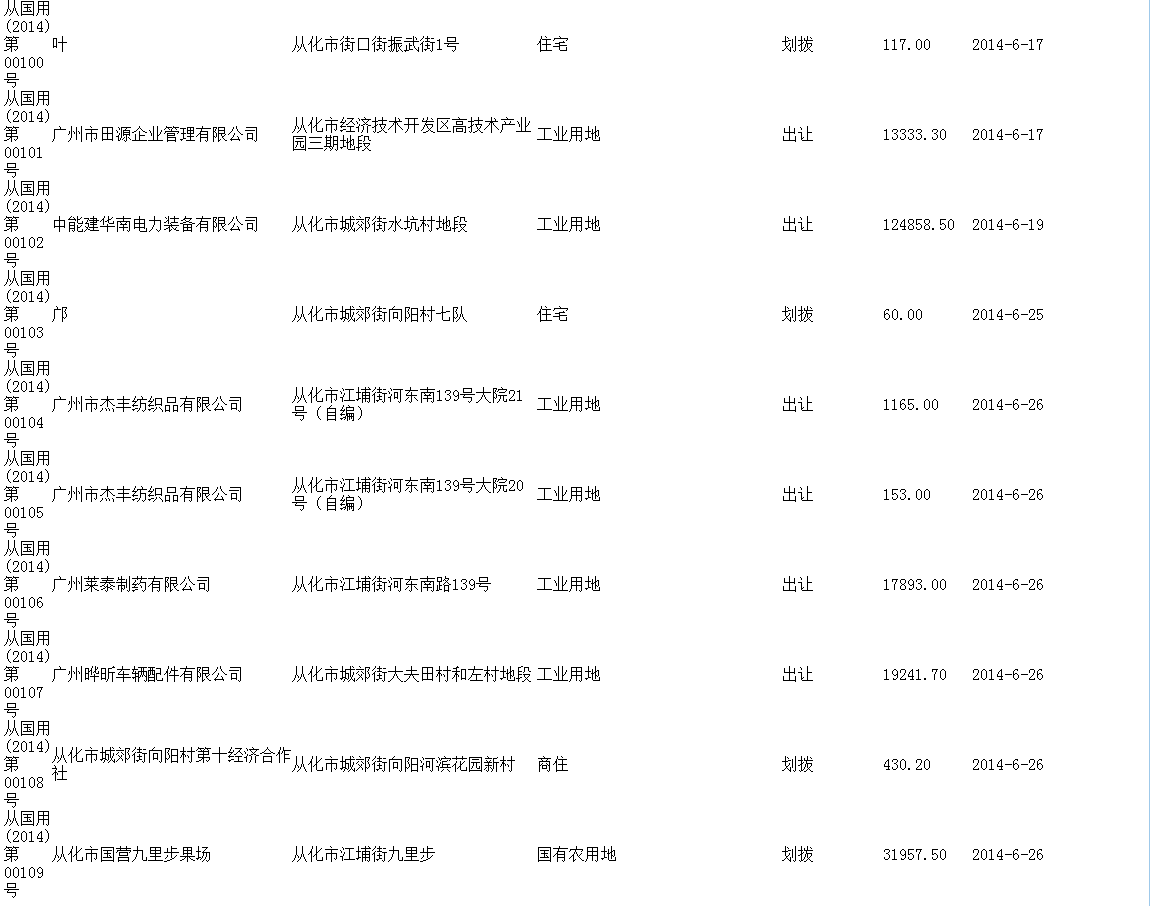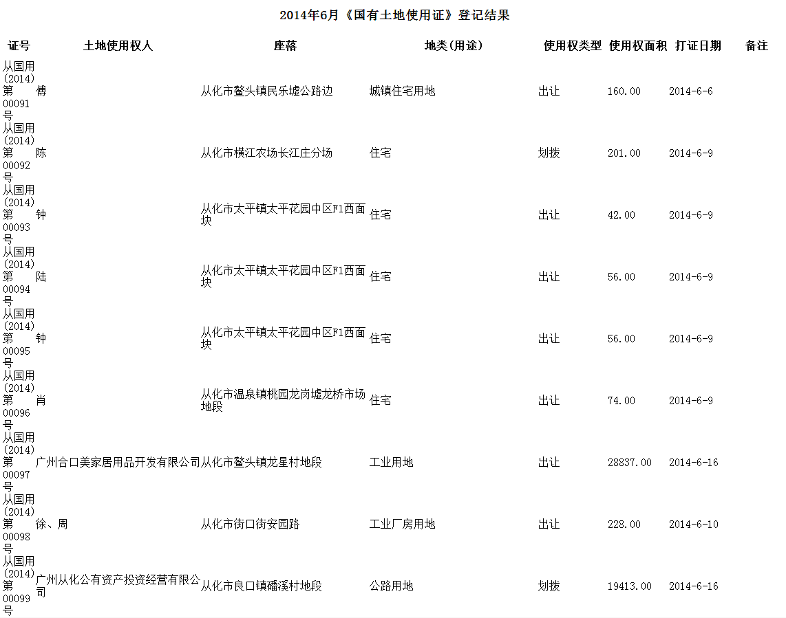 2014年6月《国有土地使用证》登记结果