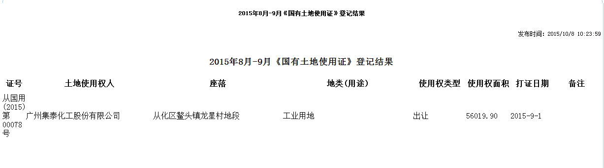 2015年8月-9月《国有土地使用证》登记结果