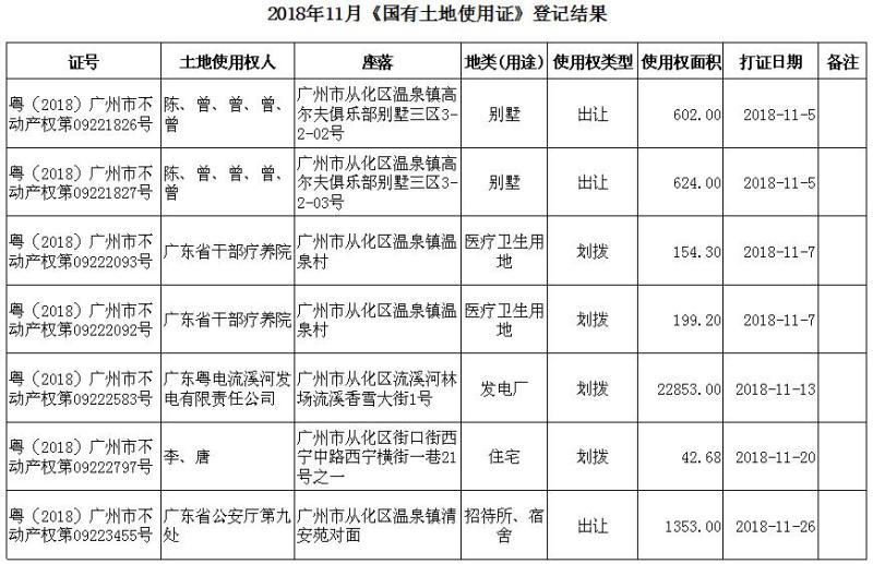 2018年11月《国有土地使用证》登记结果