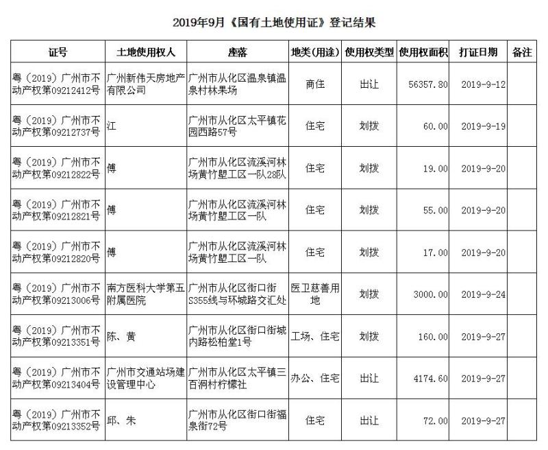 2019年9月《国有土地使用证》登记结果