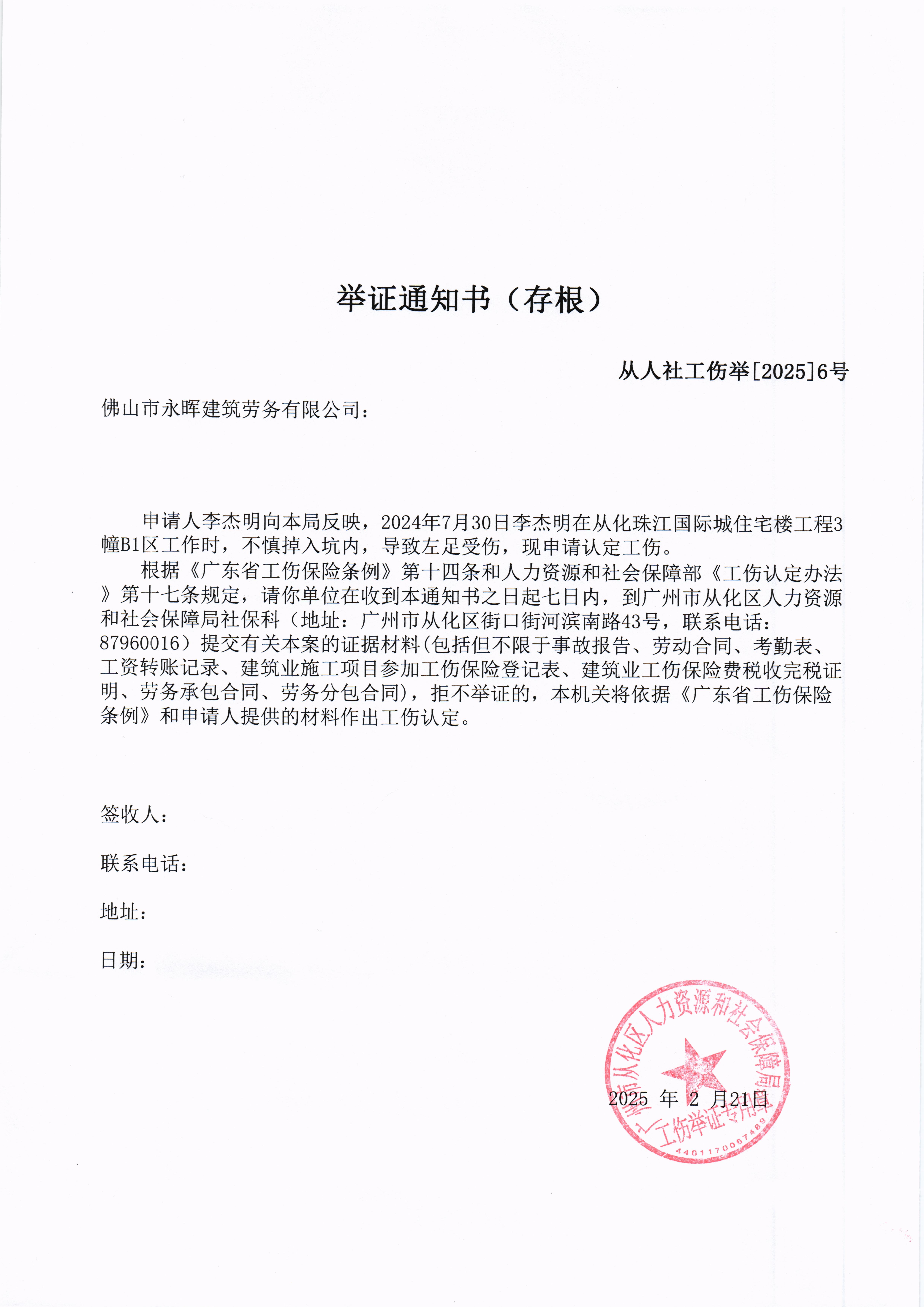 本局受理李杰明的工伤认定申请,依据《工伤保险条例》(国务院第586号令)第十九条和《工伤认定办法》(人力资源和社会保障部第8号令)第十七条“职工或者其近亲属认为是工伤,用人单位不认为是工伤的,由用人单位承担举证责任”。本局依法向你单位注册地:佛山市南海区狮山镇小塘站前路旧食街商铺23号商铺邮寄送达《举证通知书》(从人社工伤举〔2025〕6号),但无法送达。