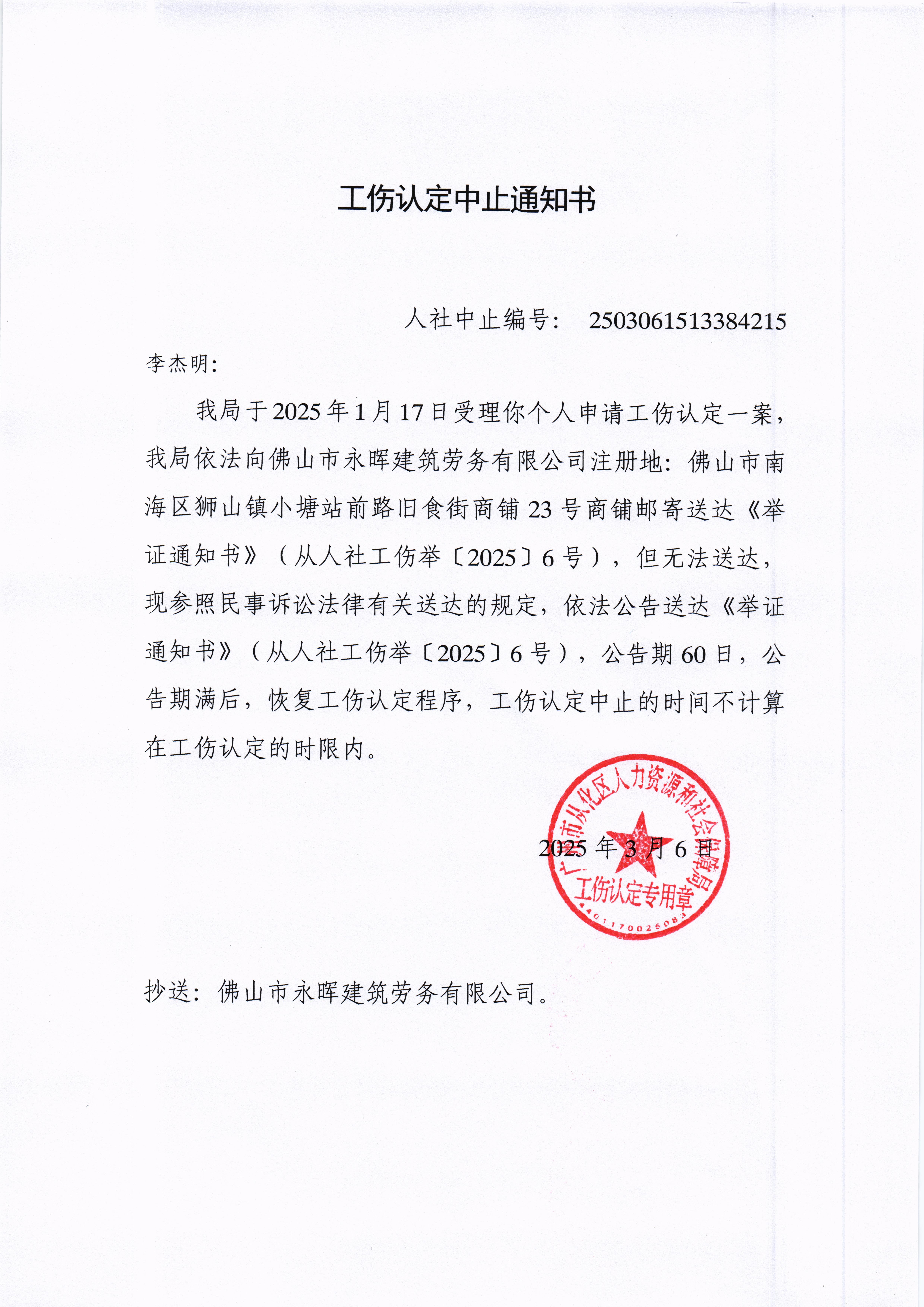 2、《工伤认定中止通知书》( 人社中止编号:2503061513384215)。