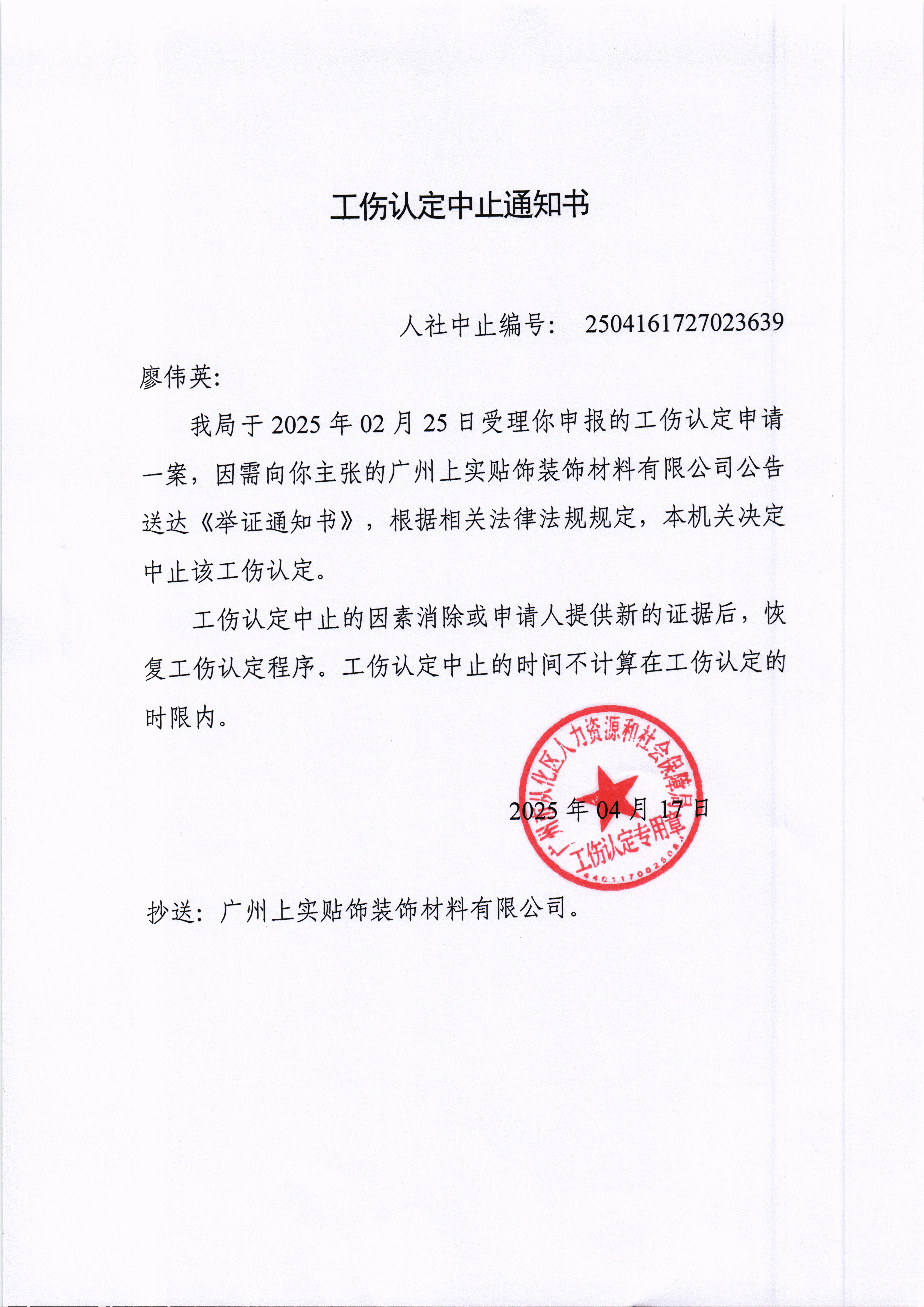 我局于2025年04月17日作出人社中止编号2504161727023639《工伤认定中止通知书》。你单位地址及联系方式不详,现本局依法向你单位公告送达。请你单位自公告之日起30日内,前来我局社保科(大发快三官网 街口街河滨南路43号人力资源和社会保障局2楼社保科)签收,逾期视为送达。