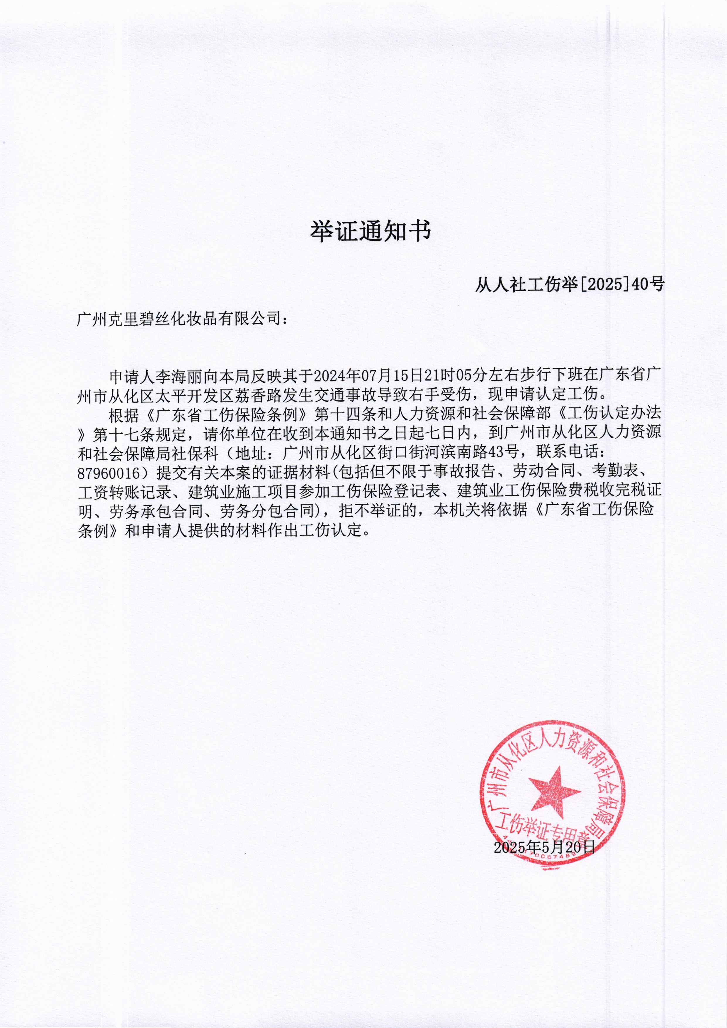 我局收到李海丽的工伤认定申请,已依法受理。现需你单位配合调查,经多方联系无果,根据相关法律法规规定,向你单位公告送达《举证通知书》(从人社工伤举[2025]40号)。请你单位自公告之日起30日内,前来我局社保科(大发快三官网 街口街河滨南路43号人力资源和社会保障局2楼社保科)签收,逾期视为送达。你单位应在公告期满之日起7日内向本局提供有关此案的证据材料,逾期不提供证据的,我局将根据《工伤保险条例》《工伤认定办法》的有关规定作出处理。