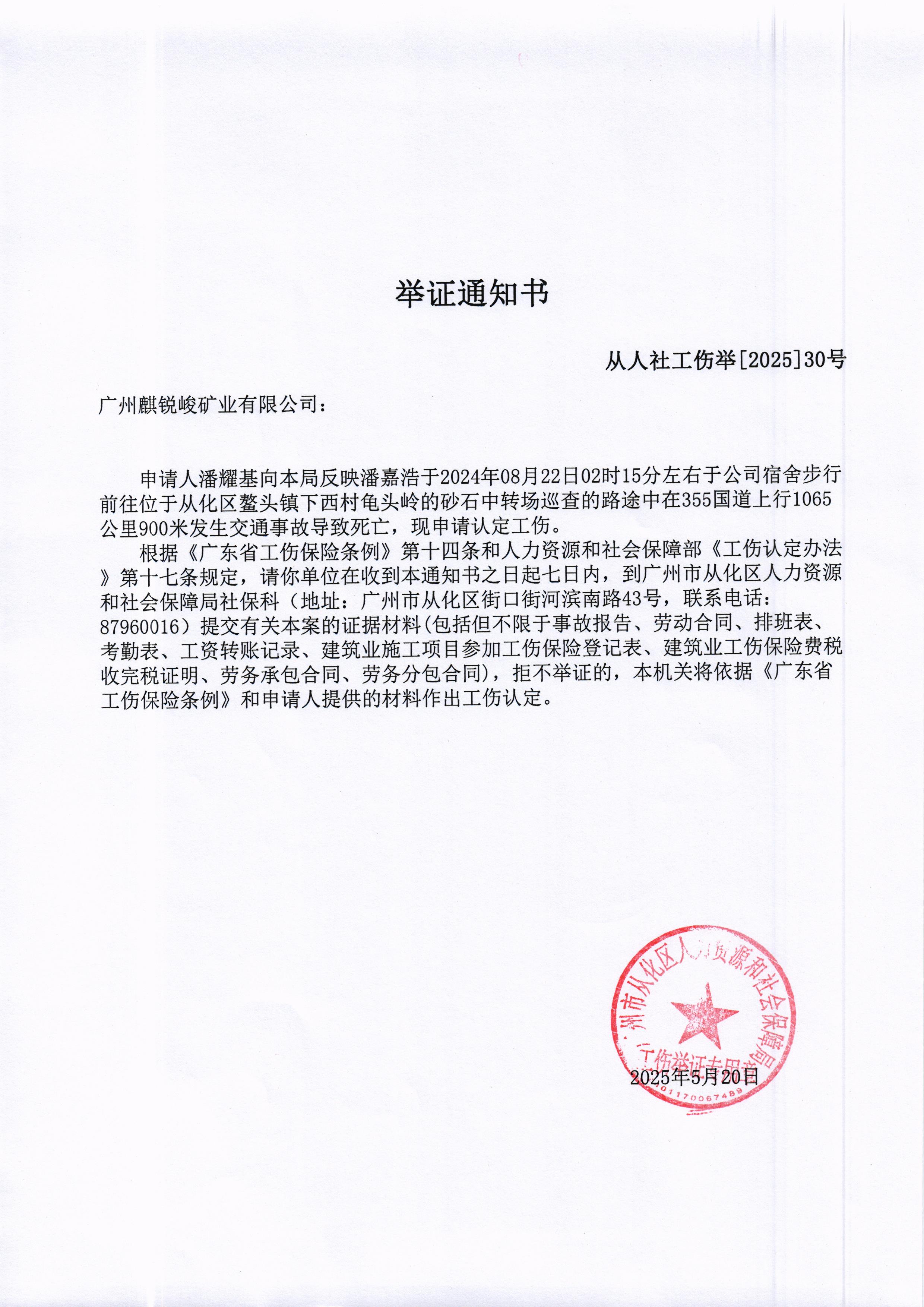 我局收到有关潘嘉浩的工伤认定申请,已依法受理。现需你单位配合调查,经多方联系无果,根据相关法律法规规定,向你单位公告送达《举证通知书》(从人社工伤举[2025]33号)。请你单位自公告之日起30日内,前来我局社保科(大发快三官网 街口街河滨南路43号人力资源和社会保障局2楼社保科)签收,逾期视为送达。你单位应在公告期满之日起7日内向本局提供有关此案的证据材料,逾期不提供证据的,我局将根据《工伤保险条例》《工伤认定办法》的有关规定作出处理。