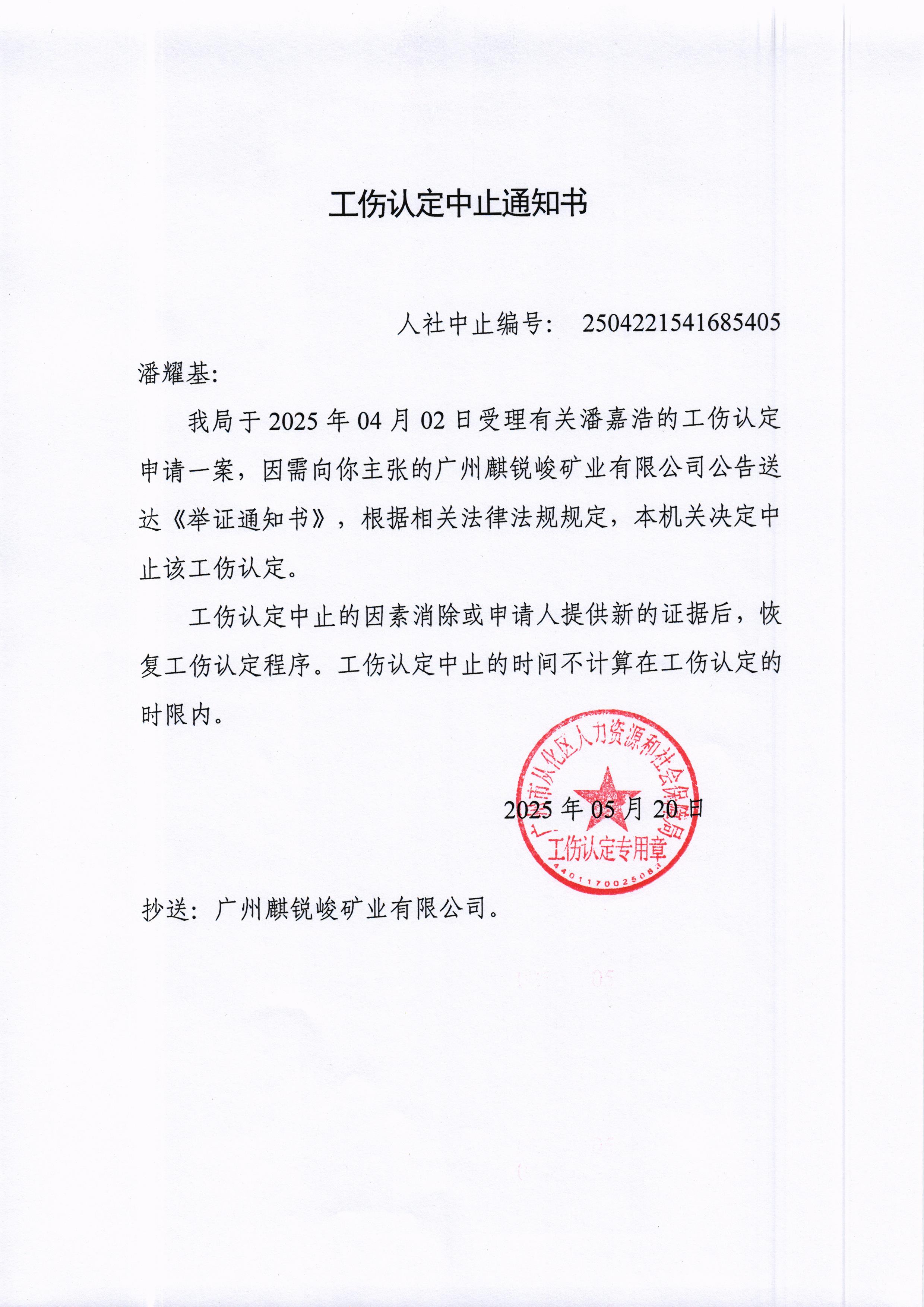 我局于2025年05月20日作出人社中止编号2504221541685405《工伤认定中止通知书》。你单位地址及联系方式不详,现本局依法向你单位公告送达。请你单位自公告之日起30日内,前来我局社保科(大发快三官网 街口街河滨南路43号人力资源和社会保障局2楼社保科)签收,逾期视为送达。