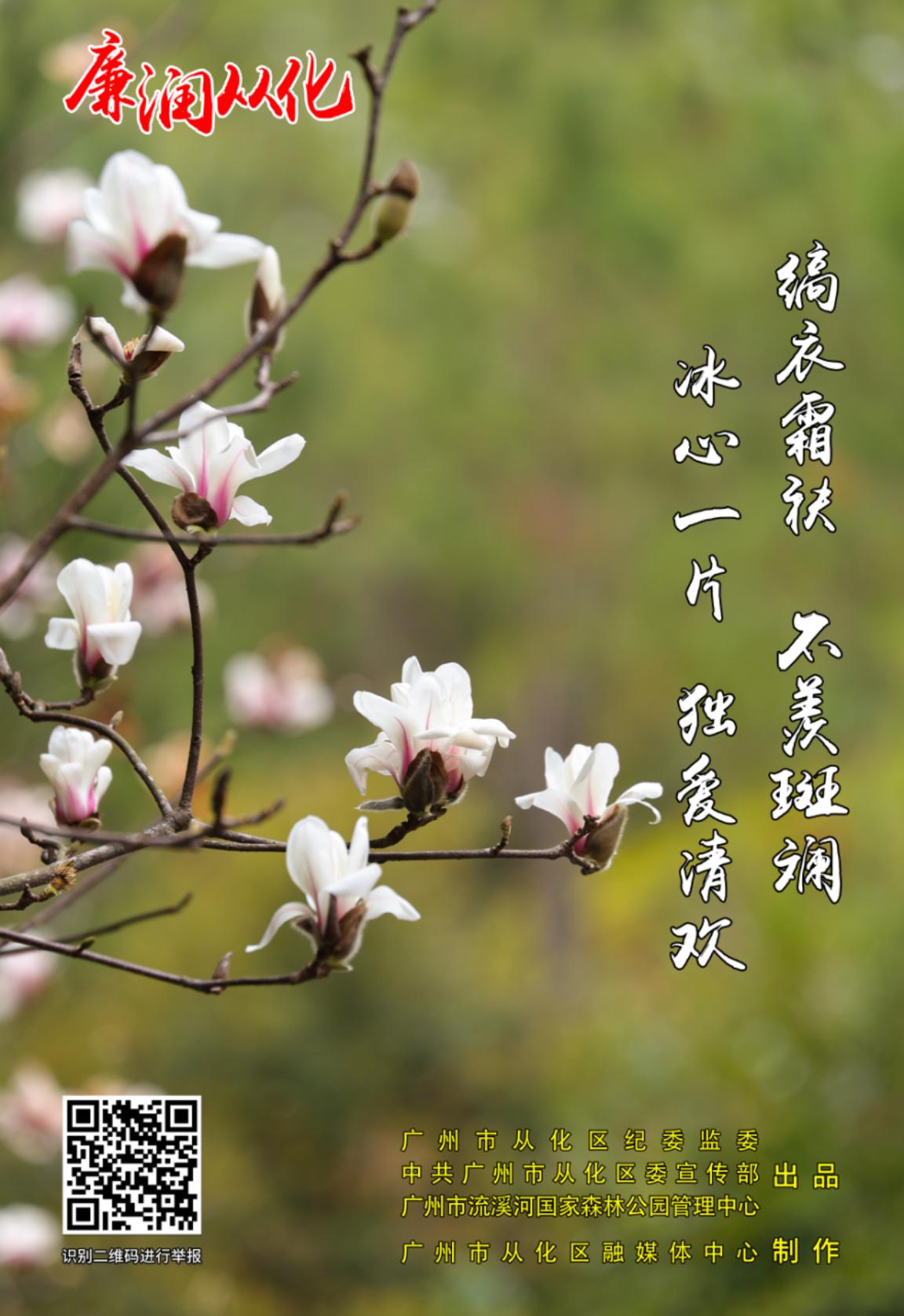 玉兰,又名迎春花、望春花、玉堂春、木兰、辛夷,因其“色白微碧、香味似兰”而得名。古人把玉兰与海棠、牡丹、桂花并列,美称为“玉堂富贵”,其栽培历史可追溯到春秋战国时代,有屈原《离骚》“朝饮木兰之坠露兮,夕餐菊之落英”为证。从化的玉兰有常春、红运、飞黄、含笑、丹馨、长花、厚叶、二乔等品种,较为出名的观赏景点有流溪河国家森林公园、良口阿婆六村、吕田小杉村、河岛公园等地。尤其是流溪河国家森林公园的“玉兰大道”,全长约2公里,道路两旁种植有白色、紫色、粉红色的玉兰,每逢二三月,一路繁花,春意盎然。